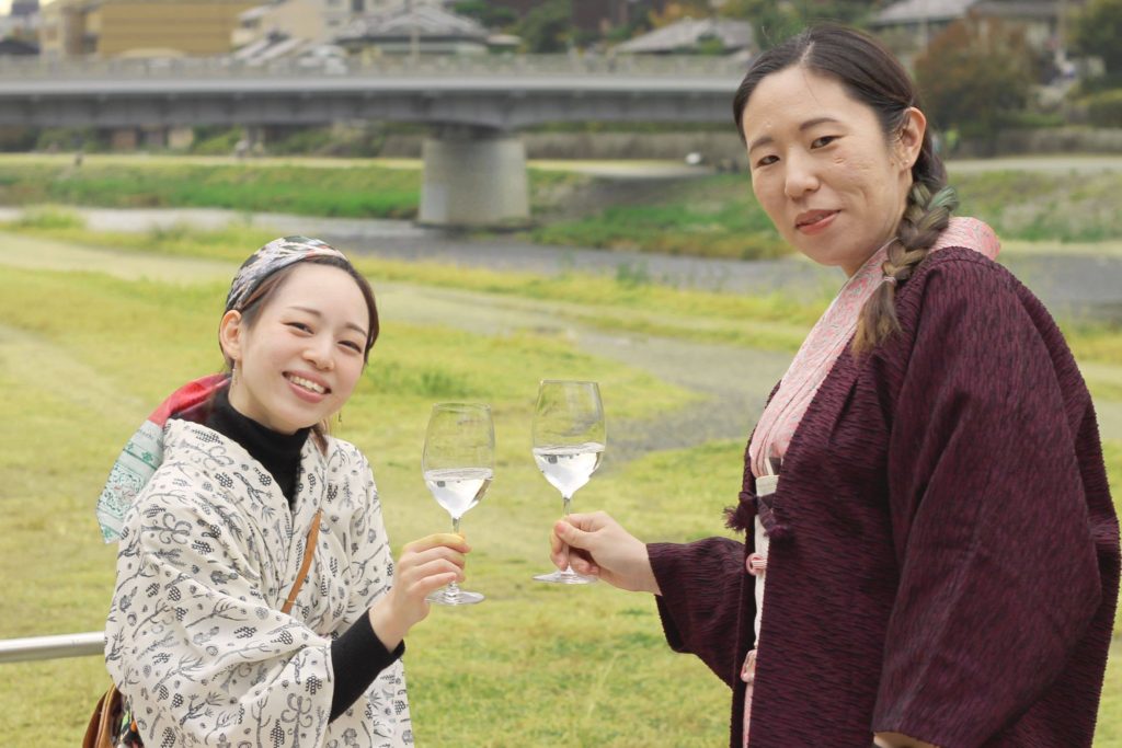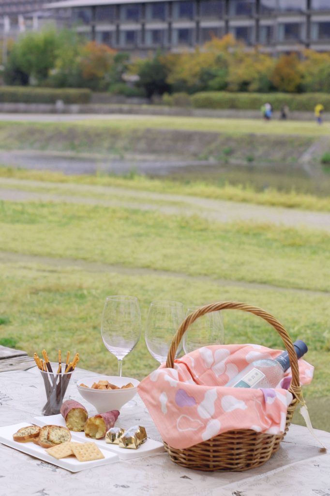せっかく女子会をするなら、秋晴れの下でピクニックがいい。鴨川でお酒とおしゃれなおつまみで大人のピクニックだ!しかもワイングラスときたら絶対に映える!名付けて「きものんべえピクニック!」