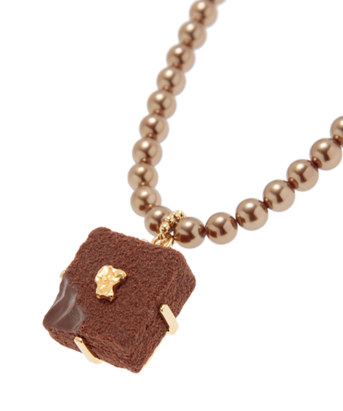 スイーツモチーフのアクセサリーといえば有名なのはQ-POT.。生チョコ風の「リュクスショコラ」シリーズが大人かわいい!こちらのネックレスは長さがたっぷりあるので衿の上から着けたり、帯の中に仕込んで根付風にショコラを覗かせてもよさそう。