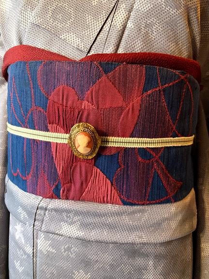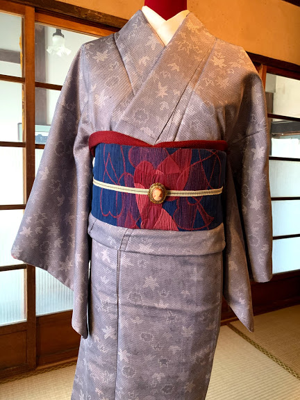 こちらはグレーの着物に濃紺の帯という寒色系でまとめたシックなコーディネート。帯の柄は水面に浮かぶ花びらなのですが、ハートが折り重なっているようにも見えませんか?