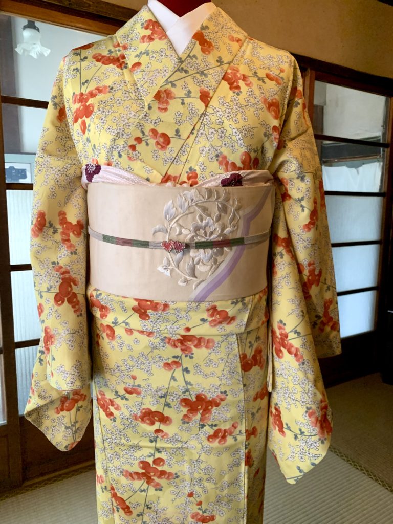 今回はもうすぐ見頃を迎える梅の柄の着物を中心にコーディネートしてみました。春が待ち遠しくなる、フレッシュな着物です。