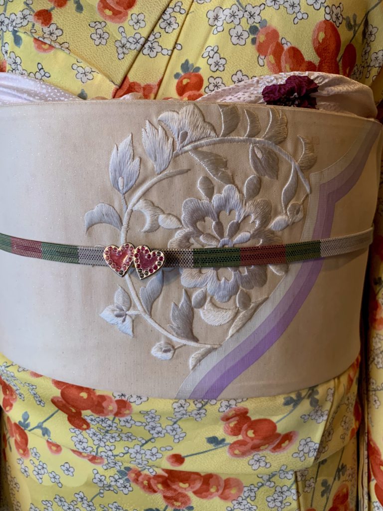 冬空に映えるクリアな印象の帯に、ハートのブローチを帯留めがわりにあしらいました。女性らしいツヤ感とかわいらしさの両方を盛り込んだコーディネートです。