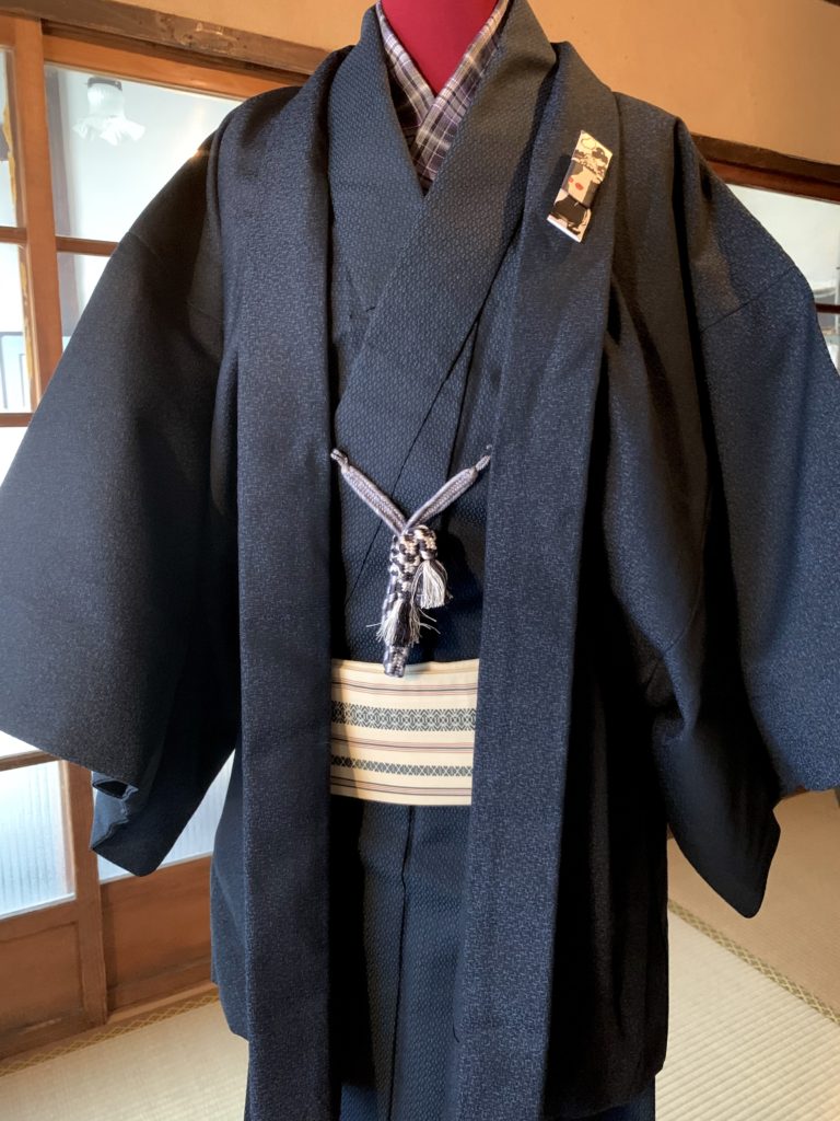 紺のアンサンブル(着物と羽織のセット)は着る人を選ばないのでビギナーさんにうってつけ。柄半衿やモノトーンの羽織紐など、小物でさりげないおしゃれを楽しんで。今回は羽織の衿元にブローチを付けてみました。