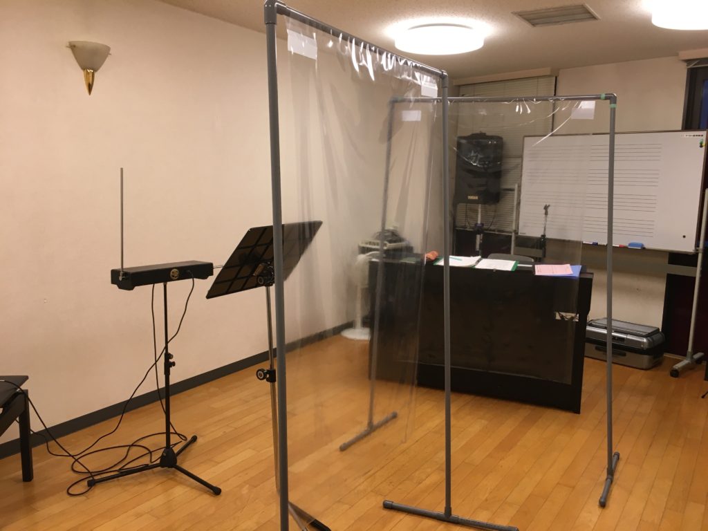 私が座る電子ピアノの前と、生徒さんが立つテルミンの前にビニールシートが。。。