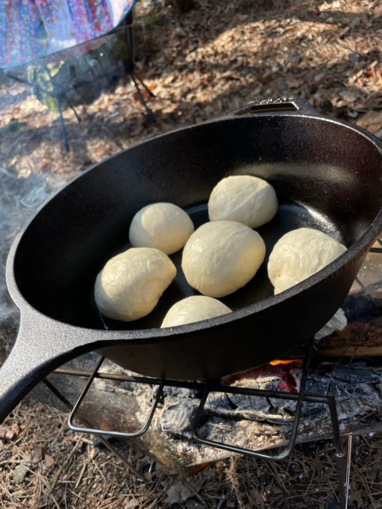 翌朝はパン生地を仕込んでスキレットを焚き火にかけて焼く。
