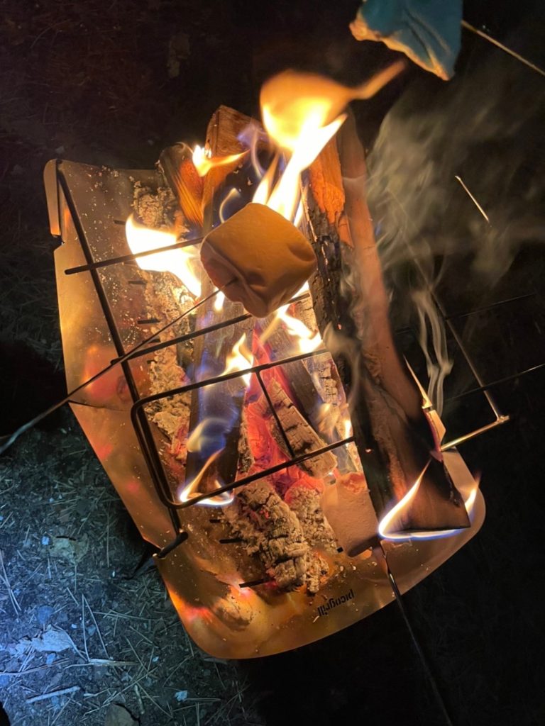 巨大マシュマロを焚き火で焼く。これは息子の大好物。でも大人が食べてもおいしいです。