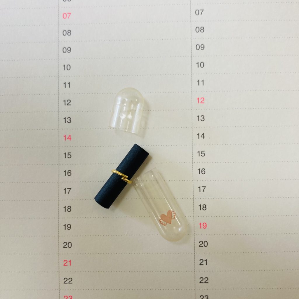 何だろう?と思ってカプセルを開け、金の輪っかをはずし、クルクルと筒状に巻かれた黒い紙を開くと・・・。