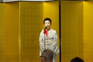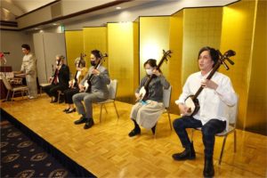 これぞ和文化と言わんばかりの会場で、新年1月15日、新潟高橋竹山会恒例の新年会が開催された。ウイルス感染防止策を徹底し、新年の新たな決意を胸にスタート。皆、艶やかな和の装いで、会場は豪華でとても華やかである。母であり二代目会主である高橋竹育先生が、凛とした和の装いで、今年一年の意気込みを語った。