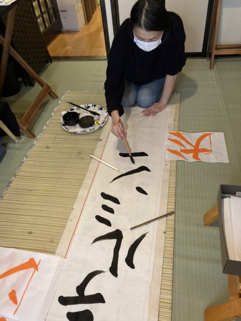 まずは体験レッスンにお邪魔して、掛け軸を作りたい、という構想をお話し、実際に使う文字を1文字ずつ繰り返し練習します。