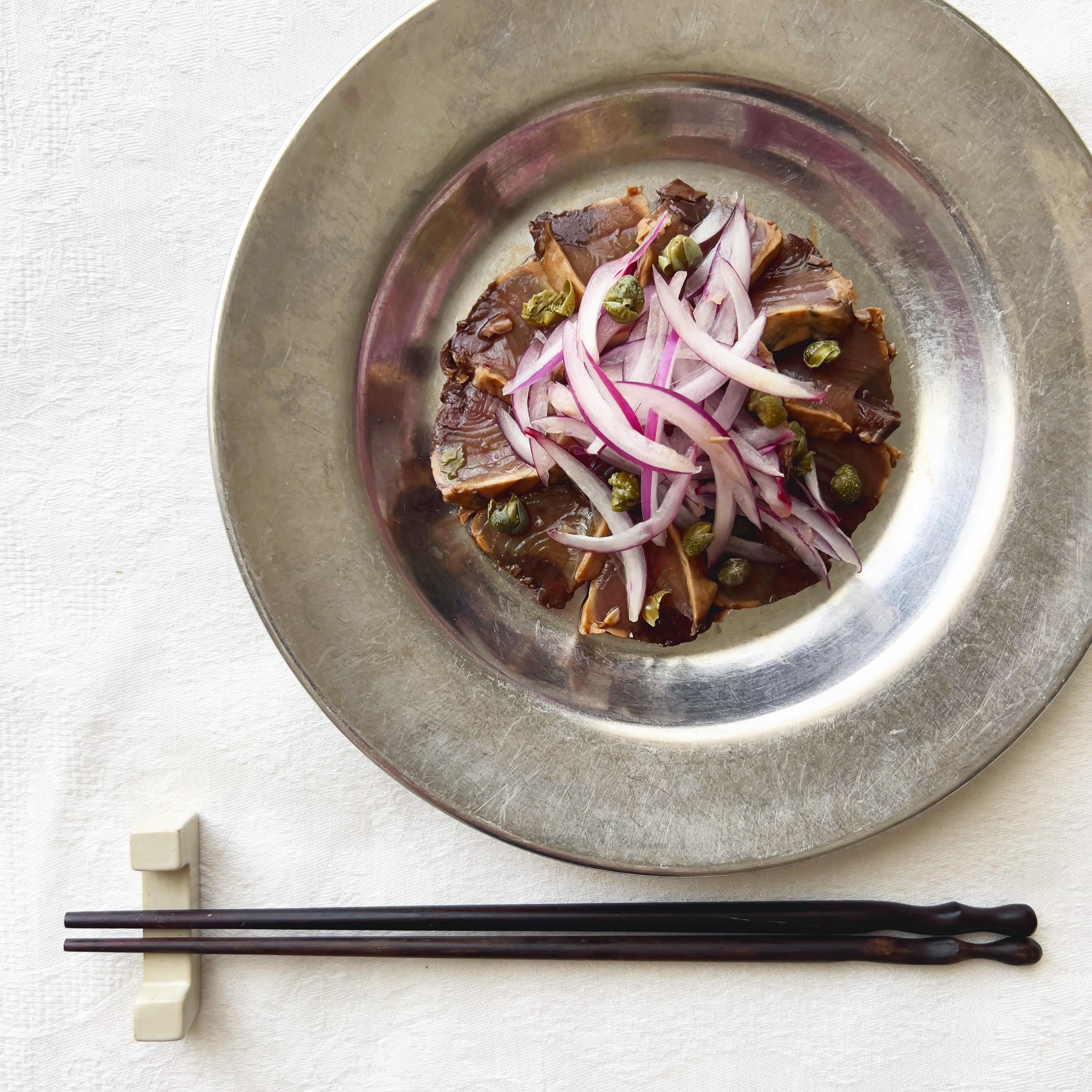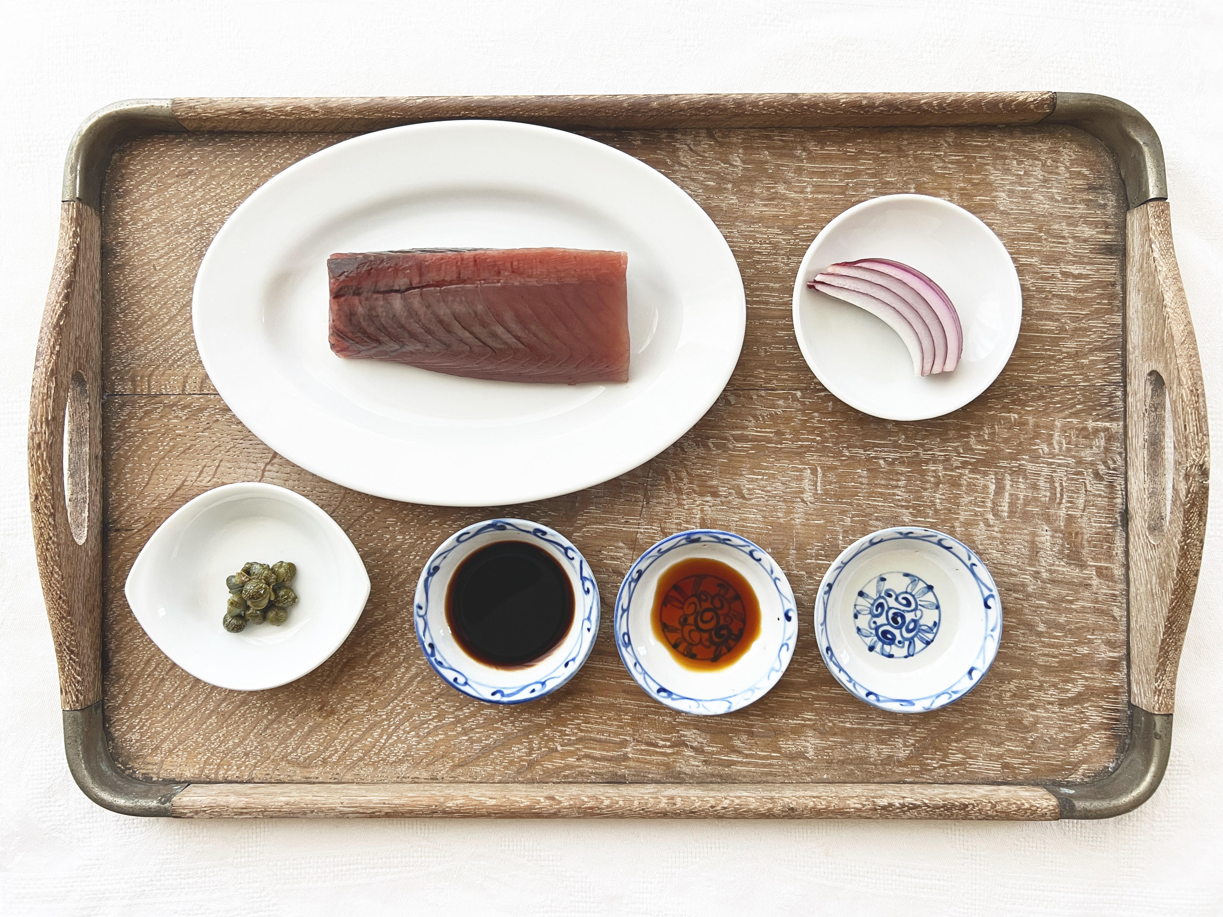 ④鰹を器に盛って全体に塩を振り、ケッパーと赤玉ねぎを散らす。