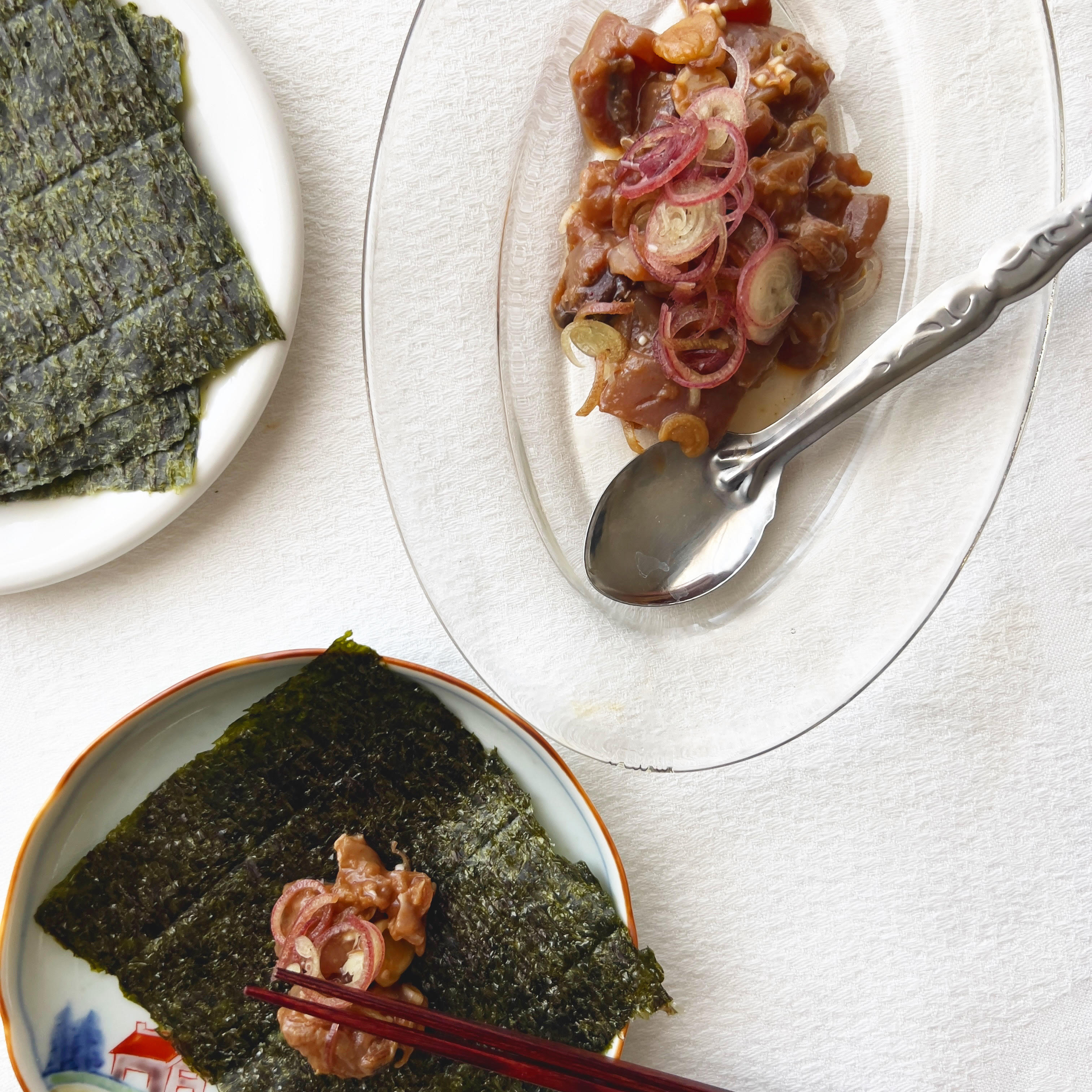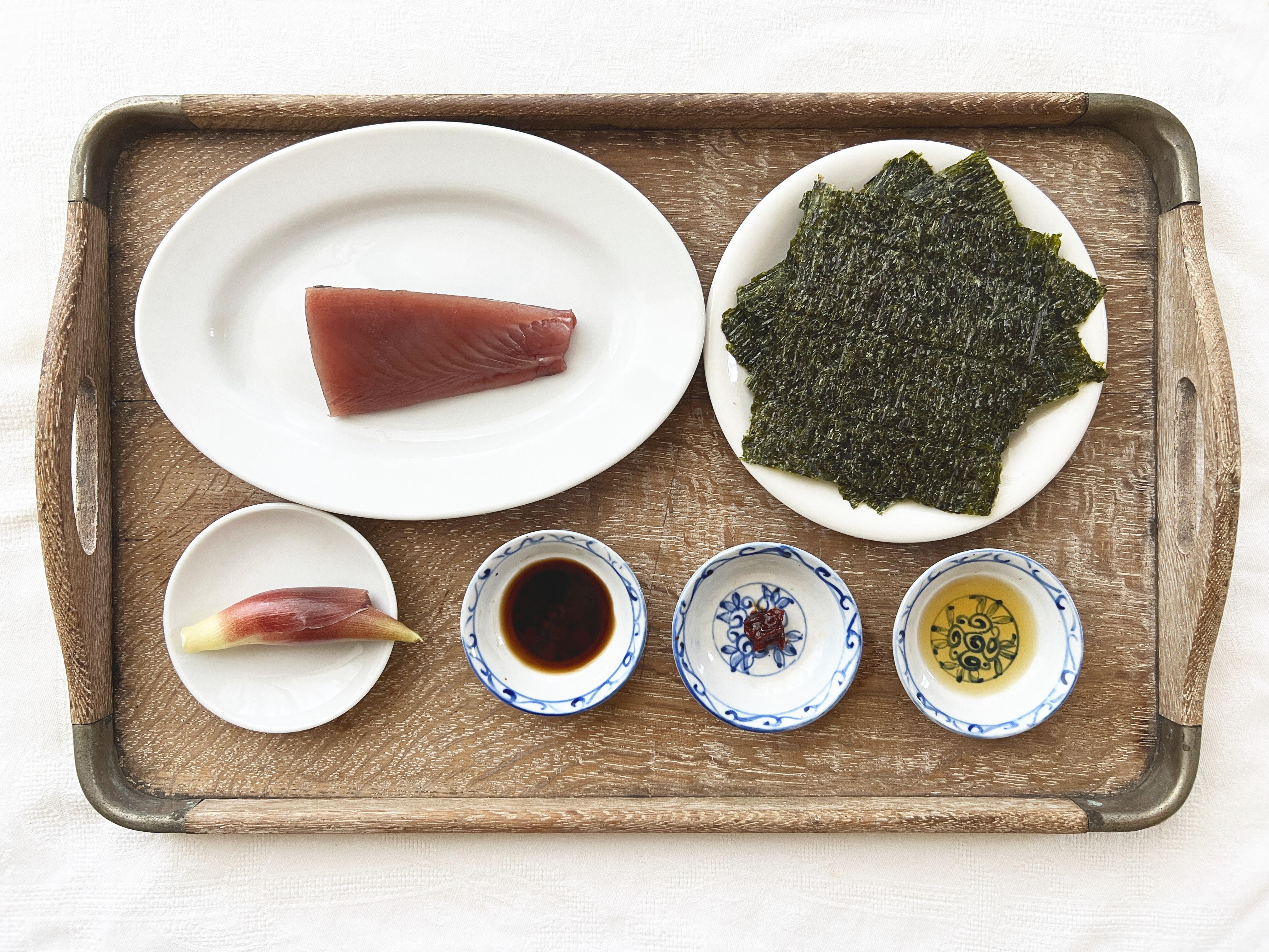 ④器に盛ってトッピングの茗荷を乗せ、1/4に切った全形海苔に巻きながらいただきます。