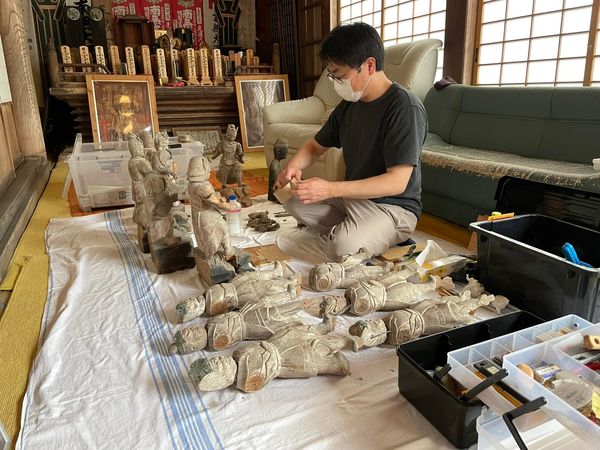 先日、能登半島で大きな地震がありました。昨今は、各地で、地震や洪水で、文化財に被害が出ることが多くなっています。私のところでは、災害時には、「地域歴史文化財保存支援」という工房とは別の組織を作って、そこにご寄付を募って、交通費を出してもらって、私がボランティアで応急処置を行うという活動を行ってきました。仏像を安全に移動したり、とれてしまった、手とか足などの部材を現地で接着するという活動です。これまで様々な災害地に行って活動してきました。
