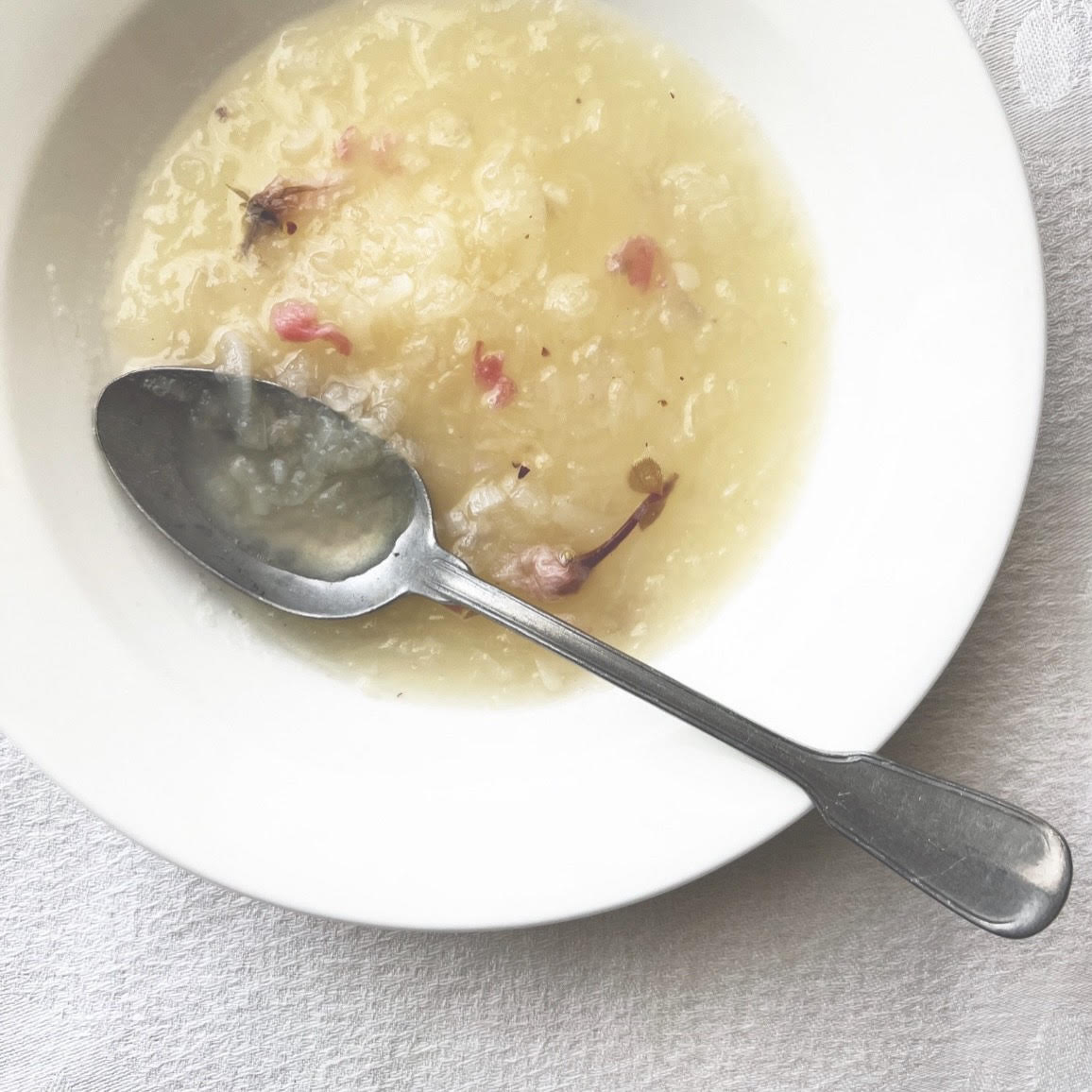 新玉ねぎの出汁、甘みに頼り切り、桜花塩漬けで塩味とニュアンスを加えた春のスープ。