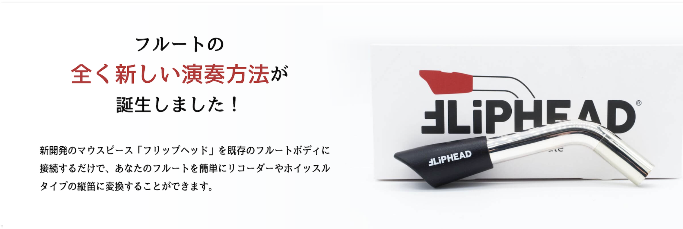 Flipheadはフルートのマウスピース(頭部管)の代わりに挿すことができるマウスピースで、リコーダーのように息の流れを音に換える機構が備わっており、ただ息を入れるだけで発音が可能となります。