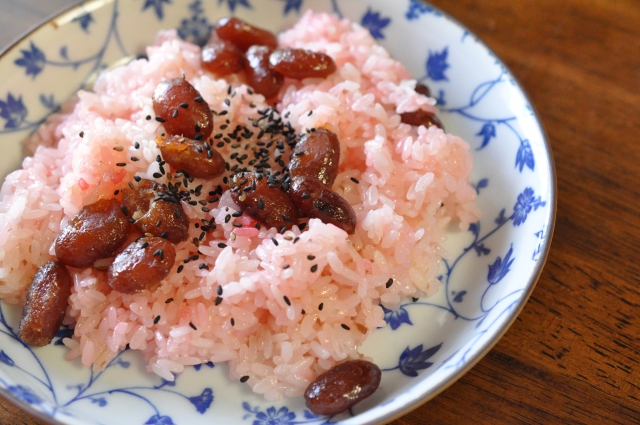甘い豆がたっぷり乗ったピンク色の赤飯。
