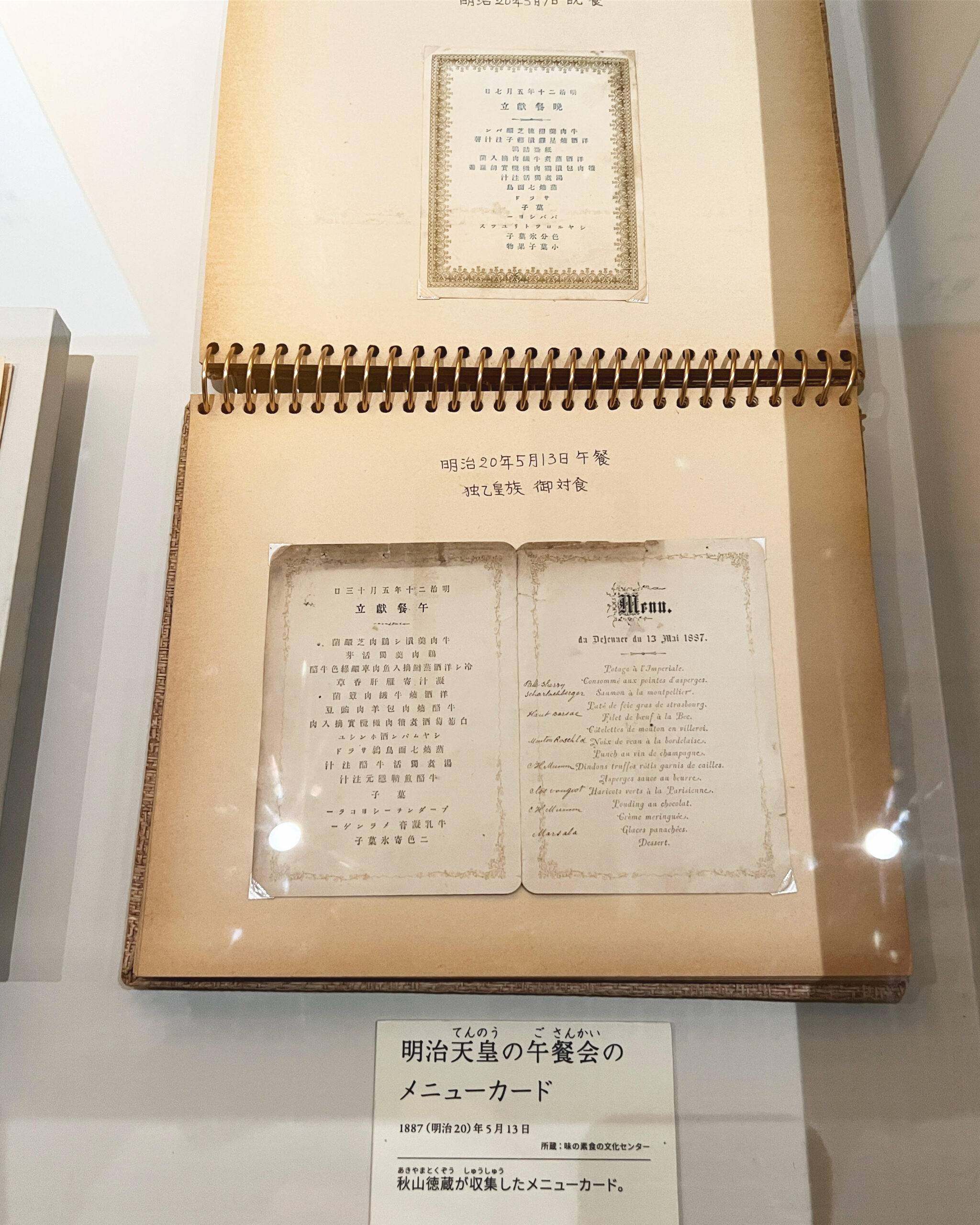 ドラマ化もされた「天皇の料理番」、秋山徳蔵氏が収集した宮中での会のメニューカードやそこから再現された料理のサンプルがあり、「よくぞこの時代に…」と見入ってしまいました。