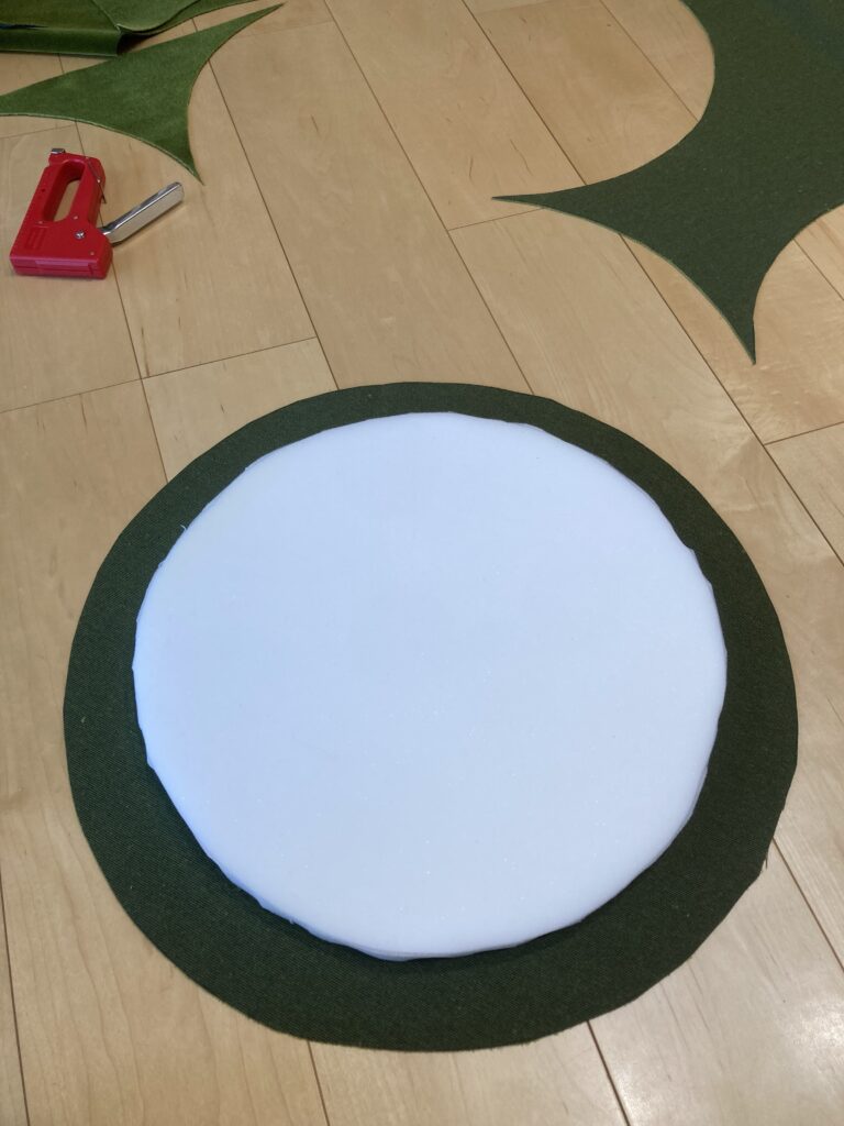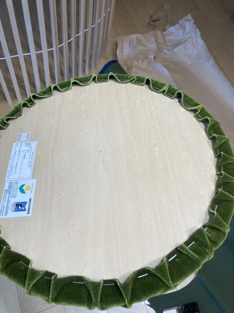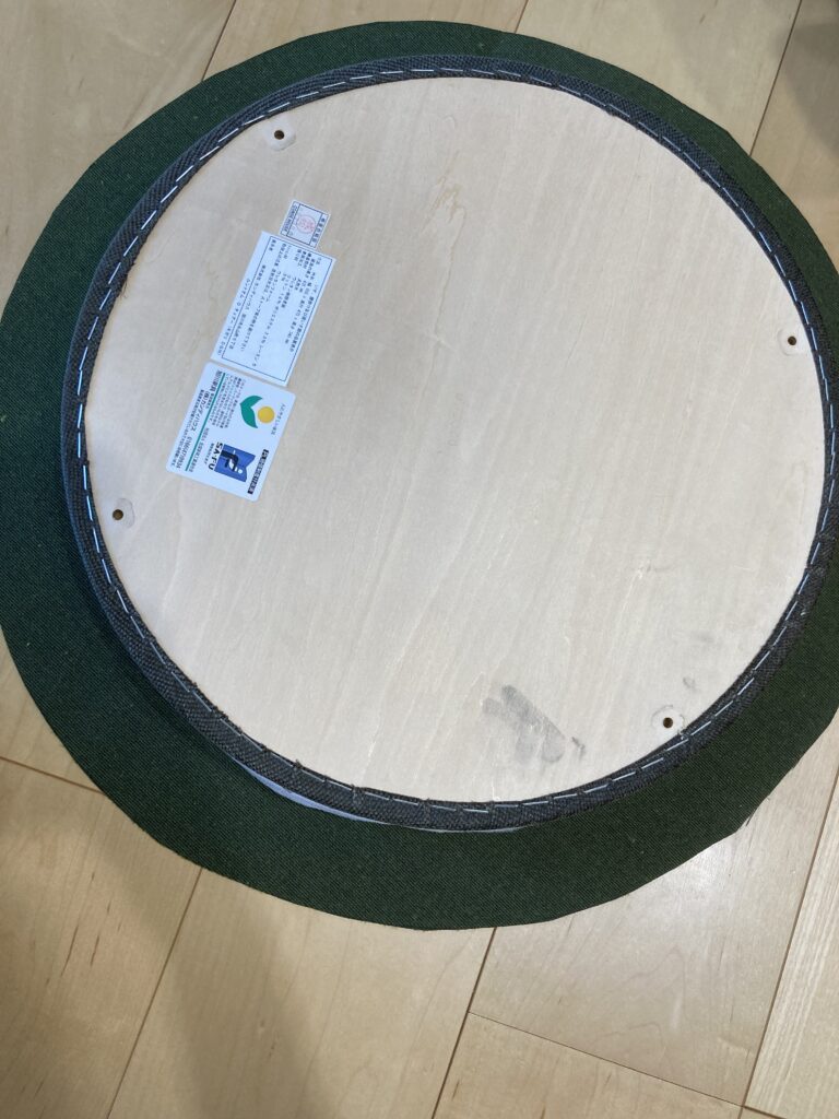 そして、お次は座面より一回り大きい円に、これから張る布を切ります。