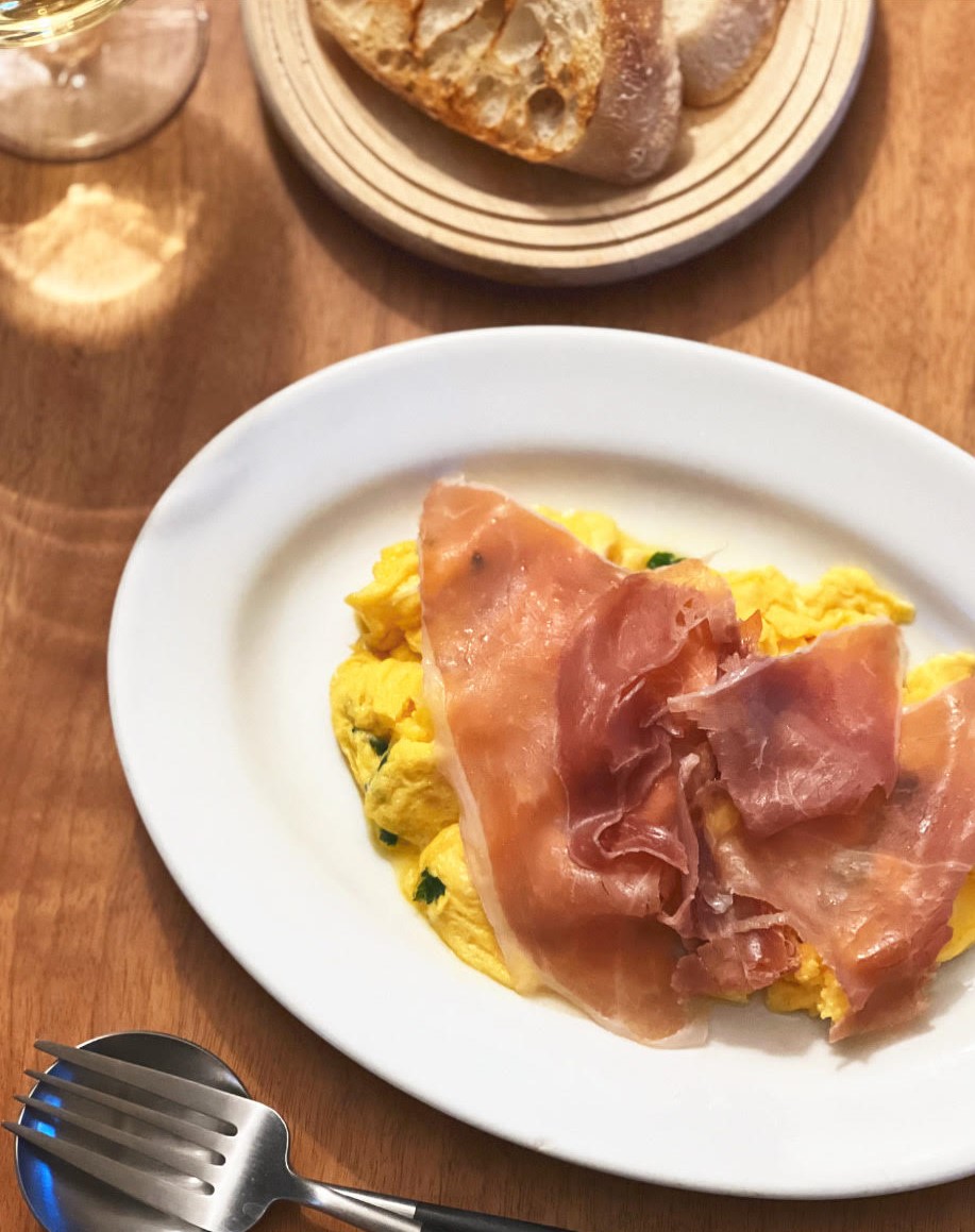 オムレツのあたたかさで、生ハムの脂がやわらかくなるのがポイント。