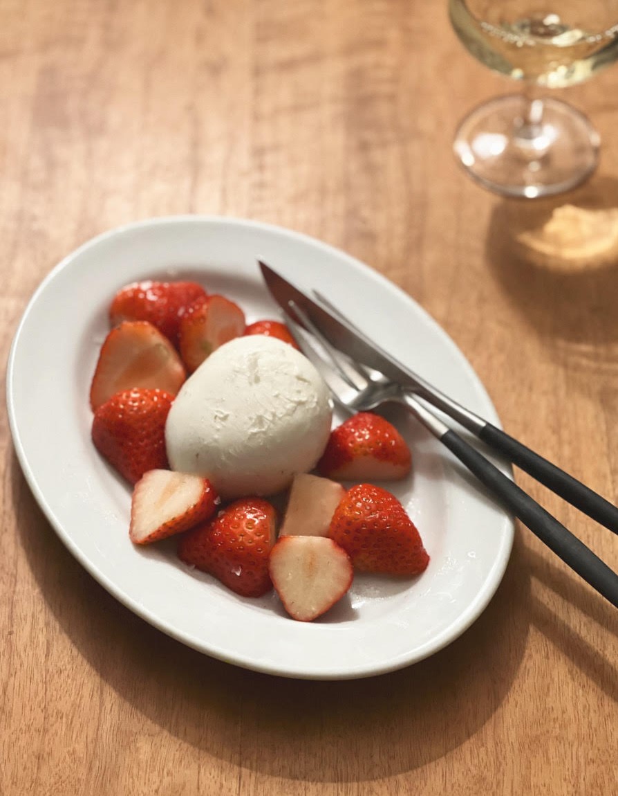 モッツアレラを切ることもせず、ドーンと。冷蔵庫に入れないのは、温度を少し上げてミルキーさを楽しむため。
