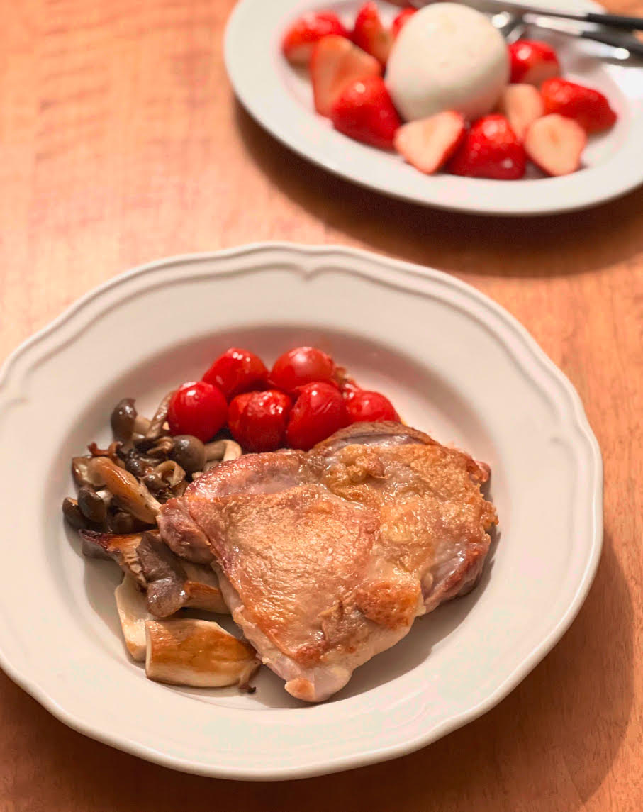 付け合わせの野菜を多めに、きのこやブロッコリーにしたら栄養バランスも良くなっていくけど、そこまで考えず、チキンとトマトだけでも十分。